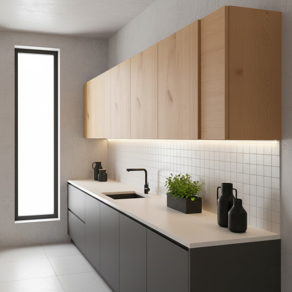 - Kierunek słoi na frontach i bokach: dopasowanie wzoru drewna do pozostałych mebli.