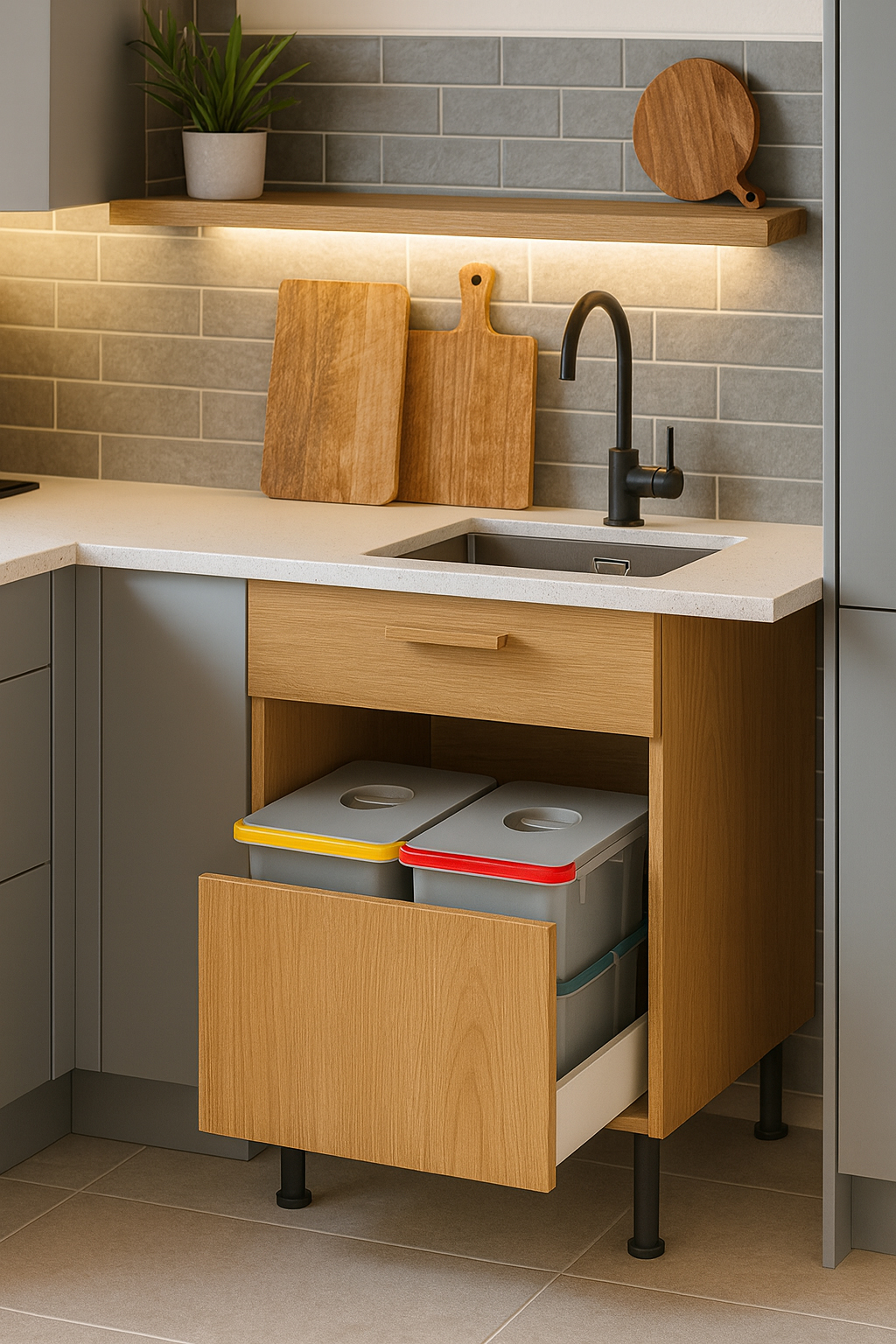 Poznaj szafkę dolną zlewozmywakową z funkcjonalną szufladą i pojemnikami na odpady – idealne rozwiązanie dla nowoczesnej kuchni. Dzięki pełnej personalizacji dostosujesz jej wymiary, sposób otwierania oraz liczbę i kolor pojemników na odpady. Zadbaj o wygodę i estetykę swojego wnętrza z FORDOMO!